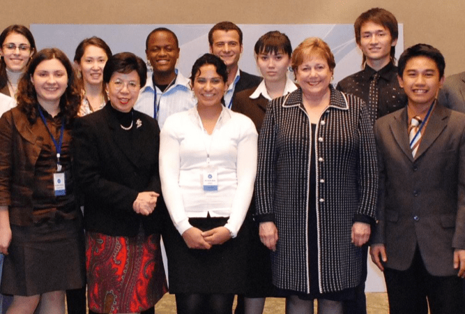 Roopa (center) and Renzo (far right) with WHO Director-General Margaret Chan (2nd from left), UNICEF Executive Director Ann Veneman (2nd from right) and other youth delegates during the 30th-anniversary conference of the Alma Ata Declaration in 2008