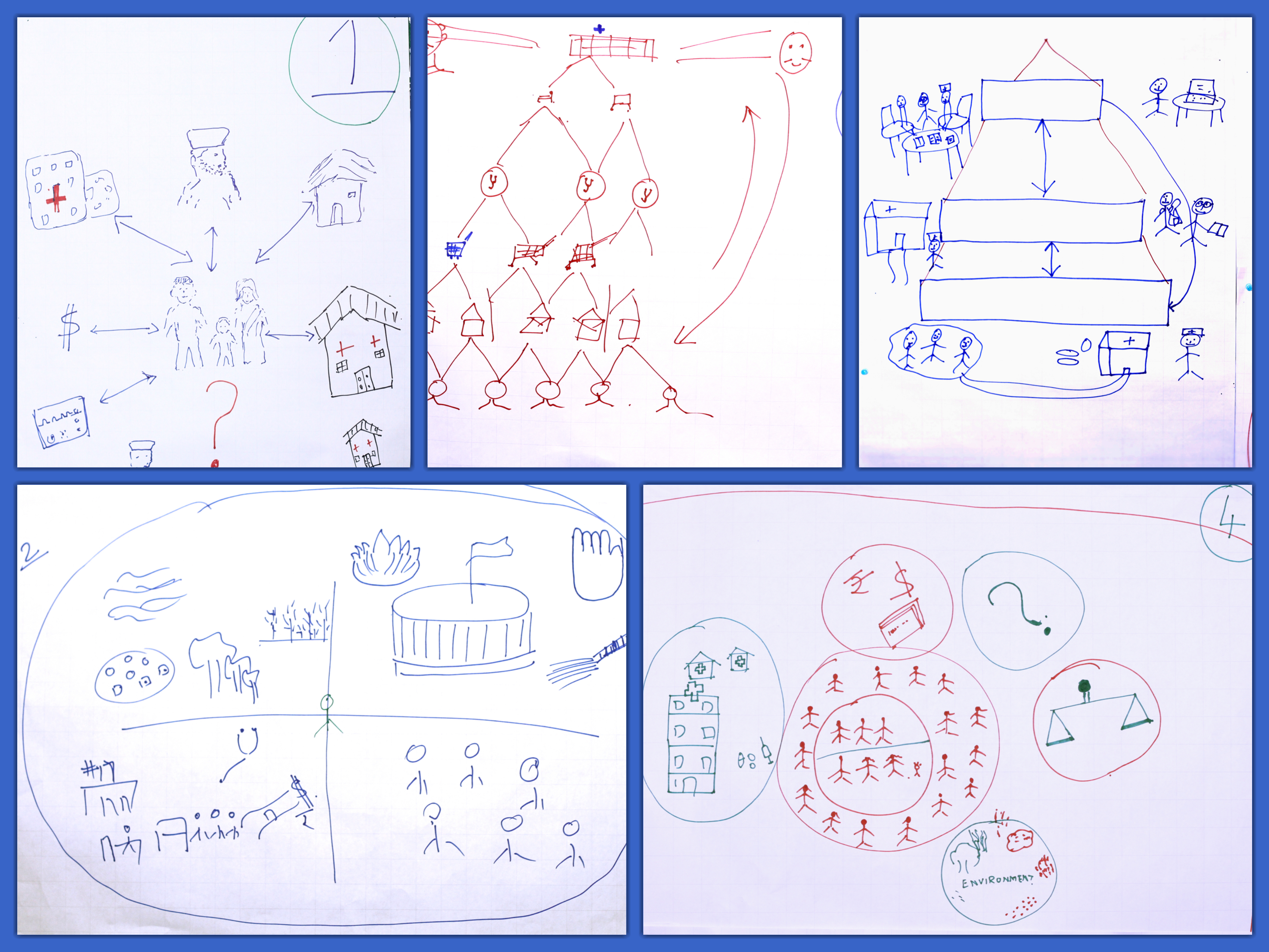 Over the next 30 minutes, health systems of various characters and feature were unveiled before the Martian. Pictures were of all hues, though most of them portrayed multiple agents as core characters in their images. One of the groups conceptualised the health system as a wheel with several key actors and institutions placed within it. The wheel denoted the inherent dynamic character of the complex health system, an explanation that every part of the health system is constantly changing. Some groups represented the power of different actors by drawing a hierarchical configuration with the more powerful actors on top of the less powerful (see figure 3).