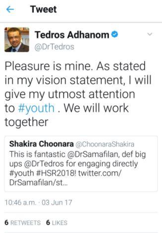The same goes for the Director General (Dr Tedros) of the World Health Organization (WHO), my favourite person at the moment when it comes to youth engagement. I have been engaging him on social media and he is extremely responsive and open to youth initiatives and promoting youth-led work. In fact so much so that the engagements have led to fellow EV Renzo Guinto and I co-leading a joint-write-up with the DG – watch this space! Not forgetting that he also retweeted our upcoming session at #ECTMIH2017! If you’re a “senior” in HPSR at the moment, other than Professor Wim Van Damme , you can’t be cooler than Dr Tedros (perhaps a need for pointers from our DG on this).