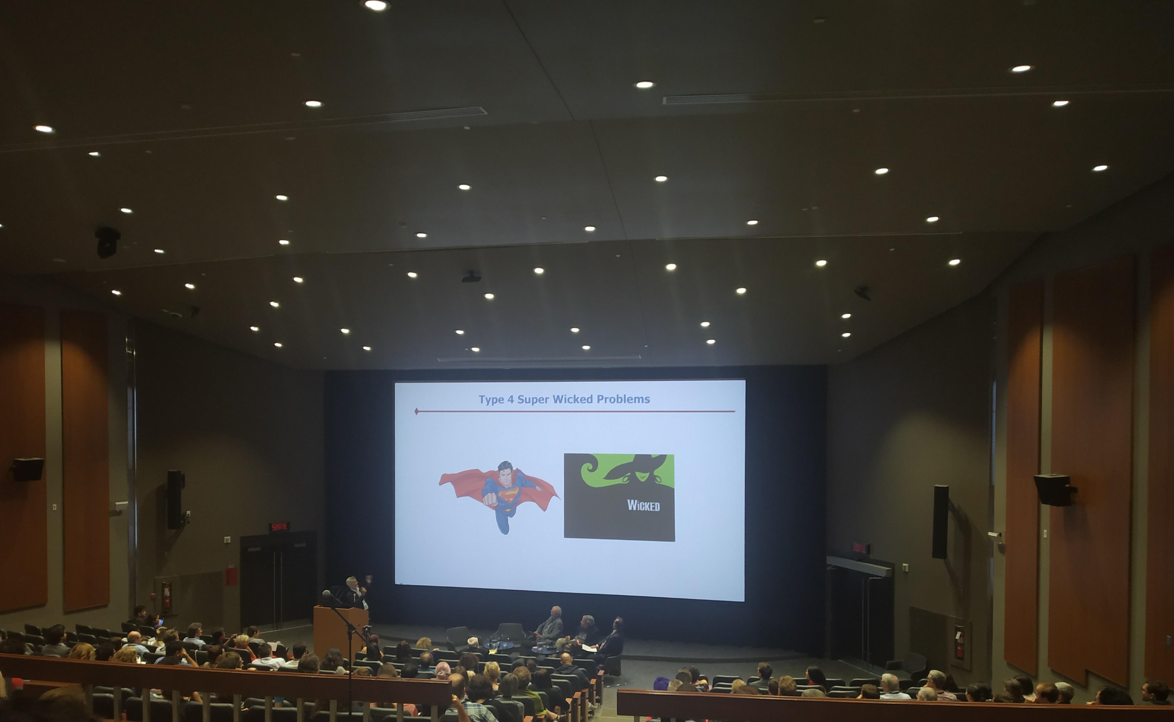 Prof. Cashore referred to the Climate Crisis as a super wicked problem for four reasons: a) time is running out (carbon stays in the atmosphere for ~300 years); b) the central authority needed to address this is weak or non-existent; c) those seeking to end the problem are also causing it – many of us are walking contradictions: we care about this, but we fly to far away conferences to talk about it; and d) lastly, the dominant policy responses are irrational based on the scientific evidence.