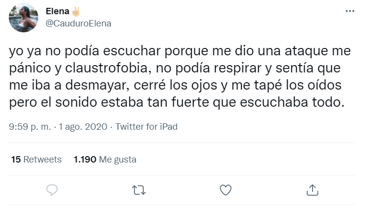 (“I couldn’t hear anymore because I had a panic attack and claustrophobia, I couldn’t breathe and I felt like I was going to pass out, I closed my eyes and covered my ears but the sound was so loud that I heard everything”.)