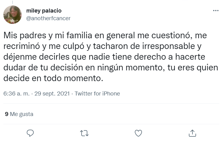 (“My parents and my family questioned, reproached and blamed me in general, and branded me as irresponsible. Let me tell you that no one has the right to make you doubt your decision at any time, you are always the one who decides”.)