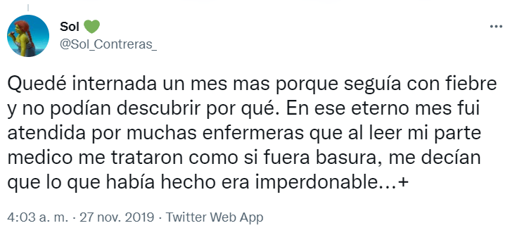 Sol pursued medical help when she developed a severe infection due to a clandestine abortion. She writes that she felt lucky when a female gynecologist accepted to treat her, after the previous doctor refused to provide aid.