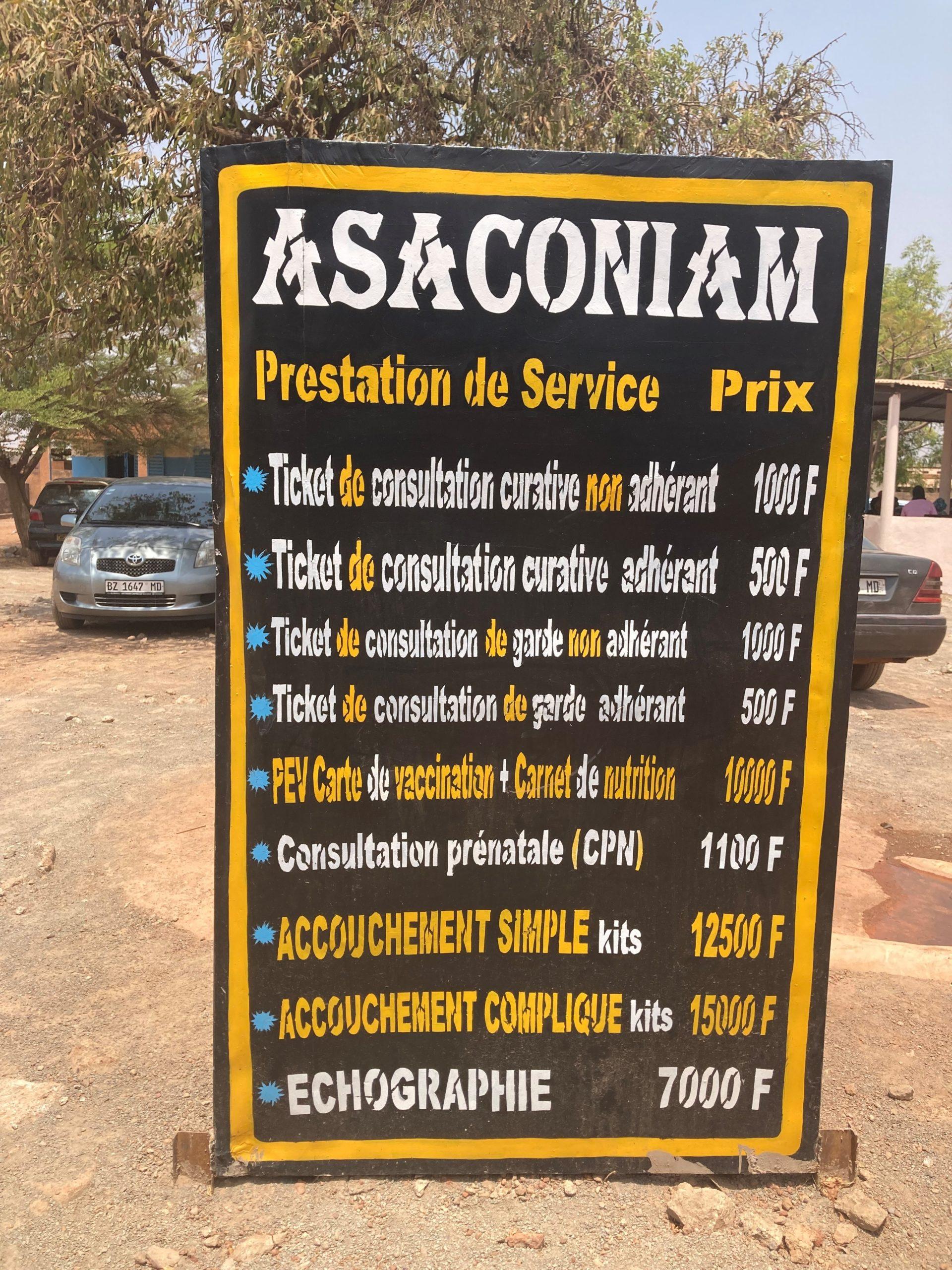 Price list of the CSCOM of Maniama (the closest CSCOM of Yirimandio camp, at the periphery of Bamako) where IDPs have to pay double the price because they are not affiliated.
