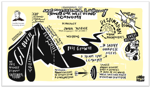 Graphic image from Timothée Parrique’s twitter account capturing his keynote on Post-growth policies at ‘ Change Now 2023’