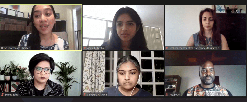 Panel 1: Dismantling Global Colonialism and Power and Privilege within Multilateral Organizations (CW from top left: Divya Santhanam, Anamika Mishra, Shehnaz Munshi, Senjuti Saha, Dr. Sumegha Asthana, and Dr. Yap Boum)