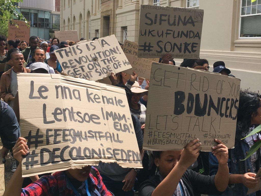 The struggle for decolonial education: Students and staff from the Faculty of Health Sciences march to the Vice-Chancellor to hand over memorandum of demands. Their posters say “We have a voice! Listen!” and “I want to learn, we all want to learn #together”. University of Cape Town, 6th October 2016.