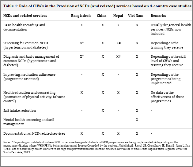 Community health workers offer one way to strengthen primary care, and support health systems faced with the challenge of addressing the growing burden of NCDs, particularly in low resource settings. Supportive policies, use of information communication technologies, multisectoral collaboration, and aligning community-based and primary care are ways to support CHWs in undertaking NCD-related activities. The country experiences of Bangladesh, China, Nepal and Viet Nam (See Table1 ) presented in the policy brief, Use of community health workers to manage and prevent noncommunicable diseases, highlight the range of activities, from data collection, screening and management of NCDs, health education and counselling to prevent NCDs which CHWs have undertaken in these countries.