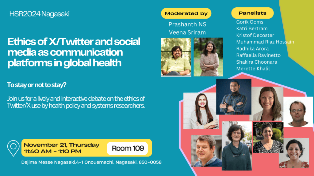 Is it ethical for health policy and systems researchers to use X, formerly Twitter? As we began planning our session several months before the 8th Global Symposium on Health Systems Research  (18-22 Nov) in Nagasaki, Japan, we wondered whether this topic was too niche. Since November, however, organizations and people have been leaving X en masse (not only because of our timely session).